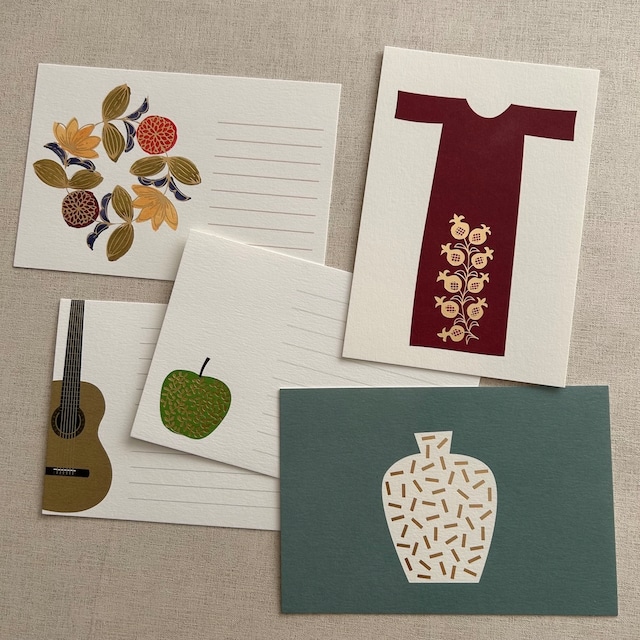 スタジオカラクサオリジナルのポストカード5枚セット。豆皿や小皿にもよく描いている、花つなぎ、青りんご、柘榴、短冊ちらし、そして大人になってから習い始めたクラシックギター、などをモチーフにしています。5種類とも箔押しが施されているのでキラキラ光ります。