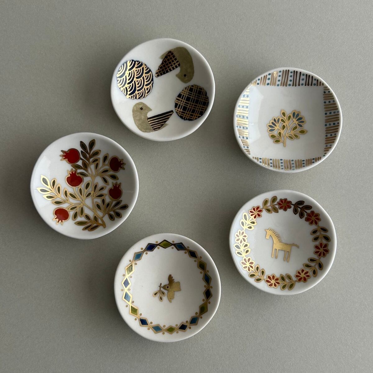 豆皿よりも小さい、まめまめ皿です。青い花、花喰鳥、柘榴、馬と花輪、鳥と丸紋、の5個セット。手びねりですので、ゆるりとした形をしています。
