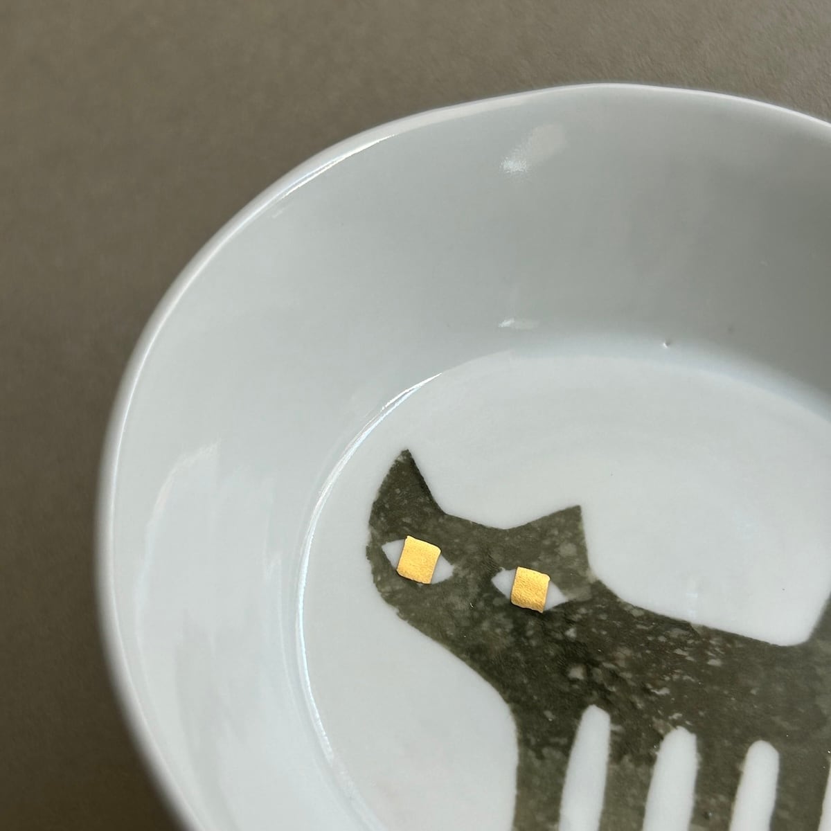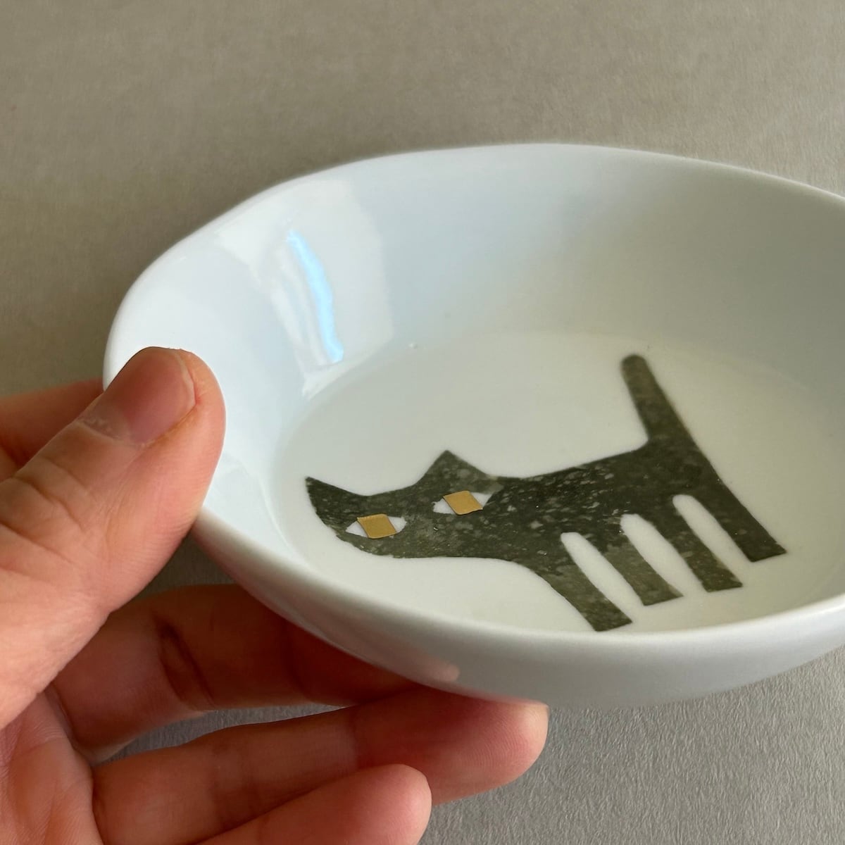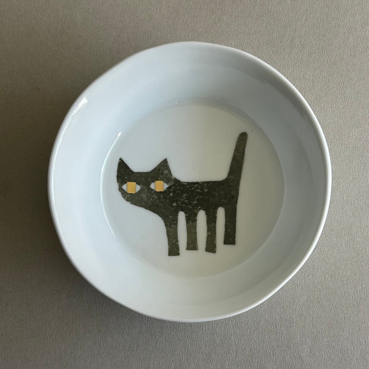 11 cm ほどの、リムのある小皿です。和紙染めという技法で描いた猫に、金彩で目を入れています。手びねりなのでゆるりとした形で、1つずつ個体差があります。プチプチで包んでお届けします。箱はありません。簡易包装にご協力ください。
